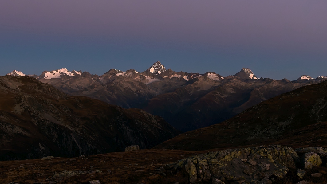 Kurz vor Sonnenaufgang auf dem Nufenenpass. Blick zu den Berner Alpen mit Finsteraarhorn in der Mitte.